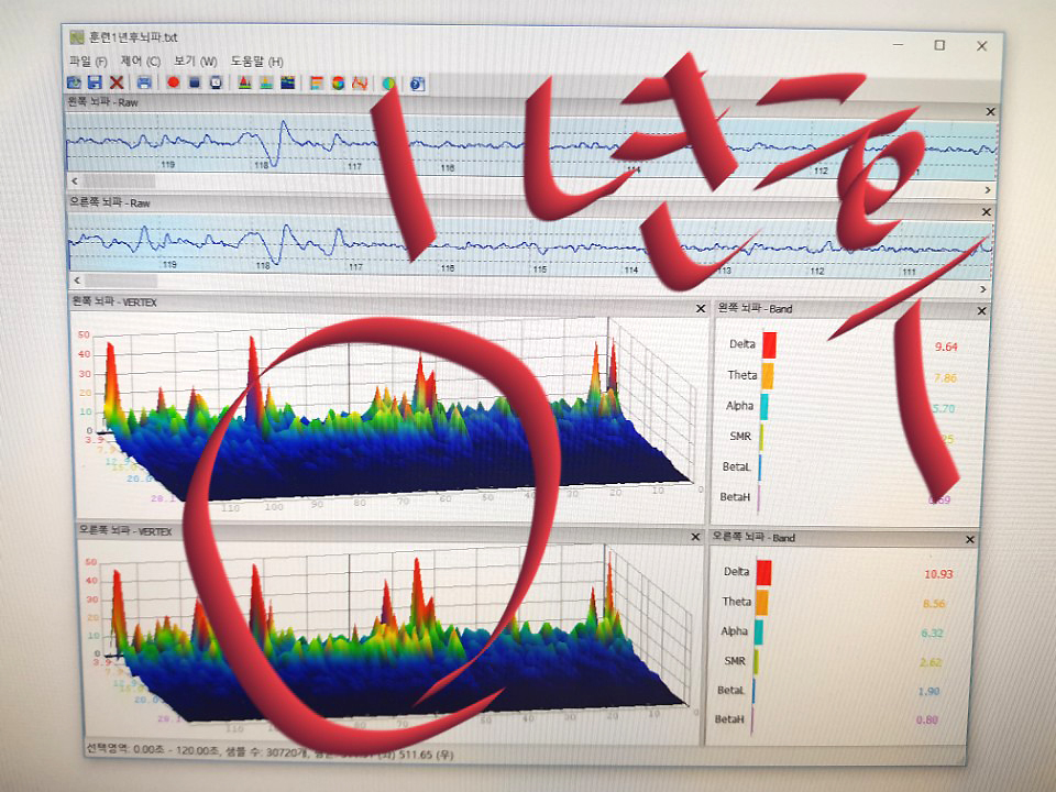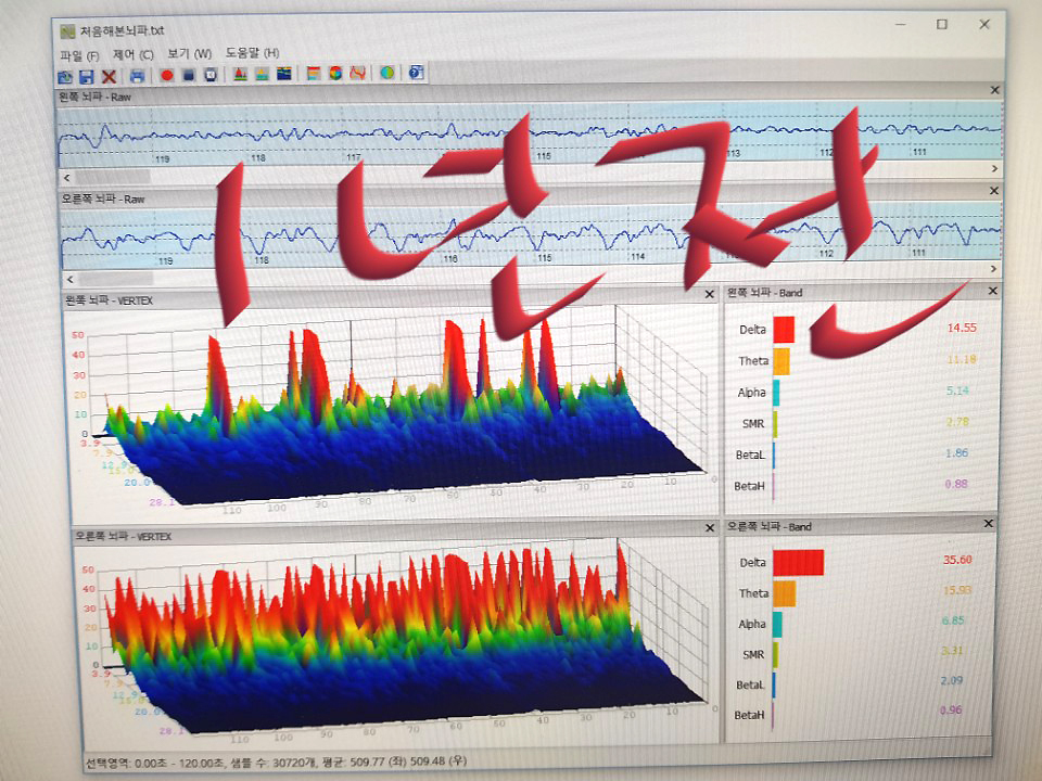 훈련전에는 좌우뇌의 뇌파 그래프 패턴이 다르고, 특히 우뇌는 델타~세타파가 많이 나와요.